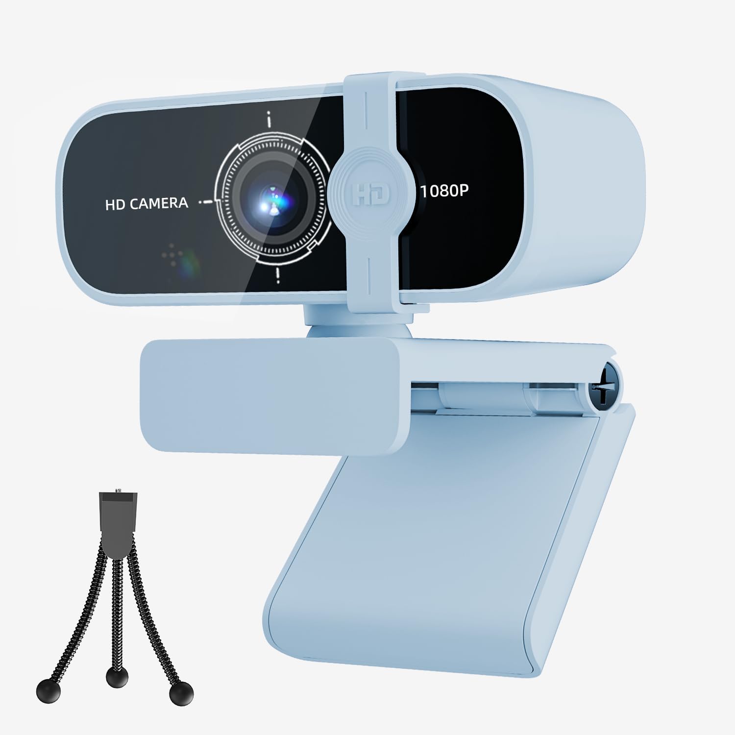 ISKOVI’s C28 Webcam in blue (3.9x1.8x1.8 in., 0.3 lbs) features 1080P, noise-cancel mic, auto light, tripod. Plug-and-play for streaming. 1-year warranty.